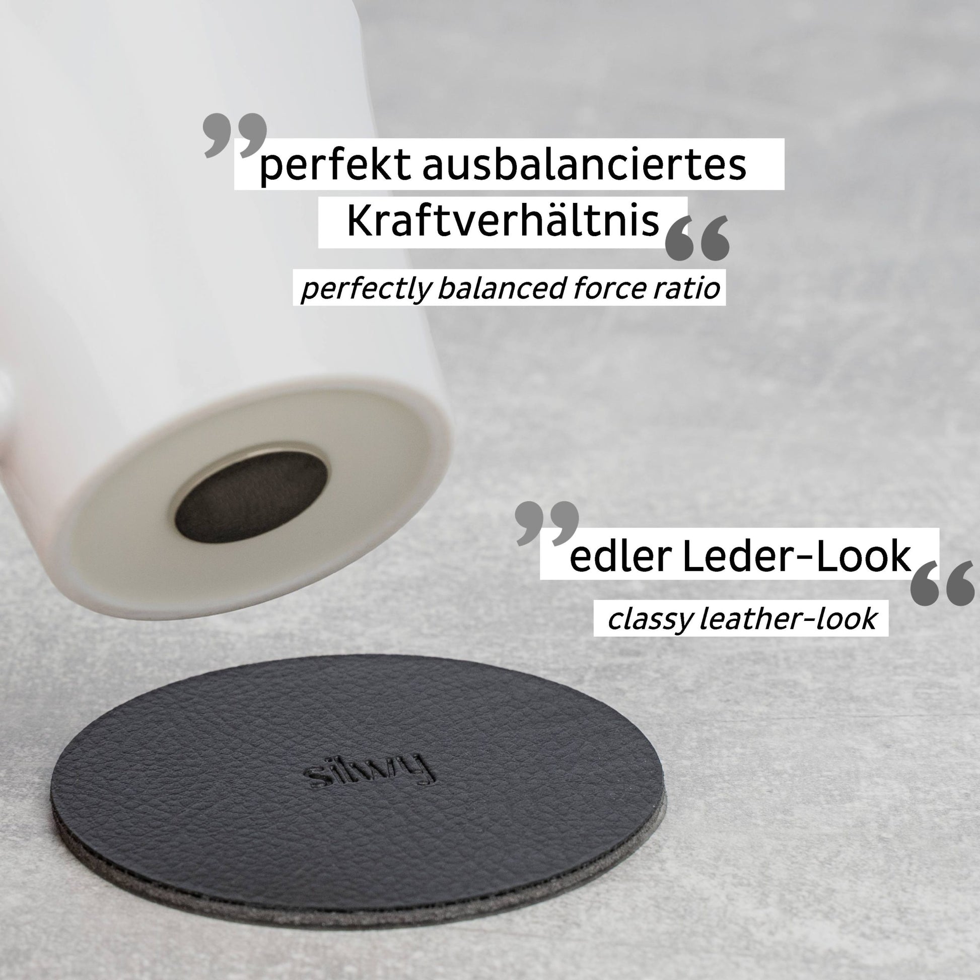 Der im Tassenboden vergossene, formschöne Magnet hält die Tassen sicher auf dem metallischen Nano-Gel-Pad. Die praktischen Pads sind abwischbar und lassen sich wiederverwenden. Sie haften auf nahezu allen versiegelten Oberflächen, ohne Rückstände zu hinterlassen.