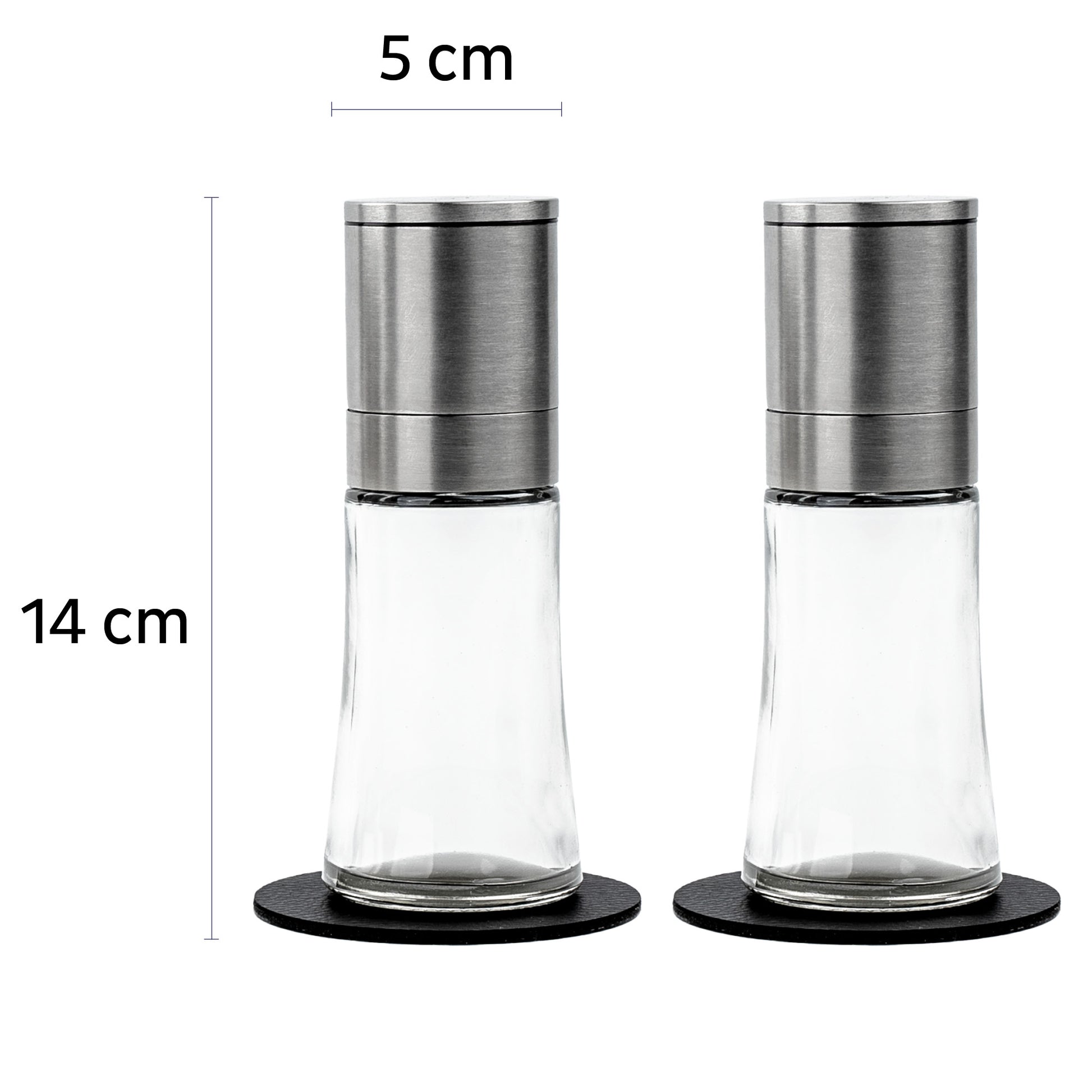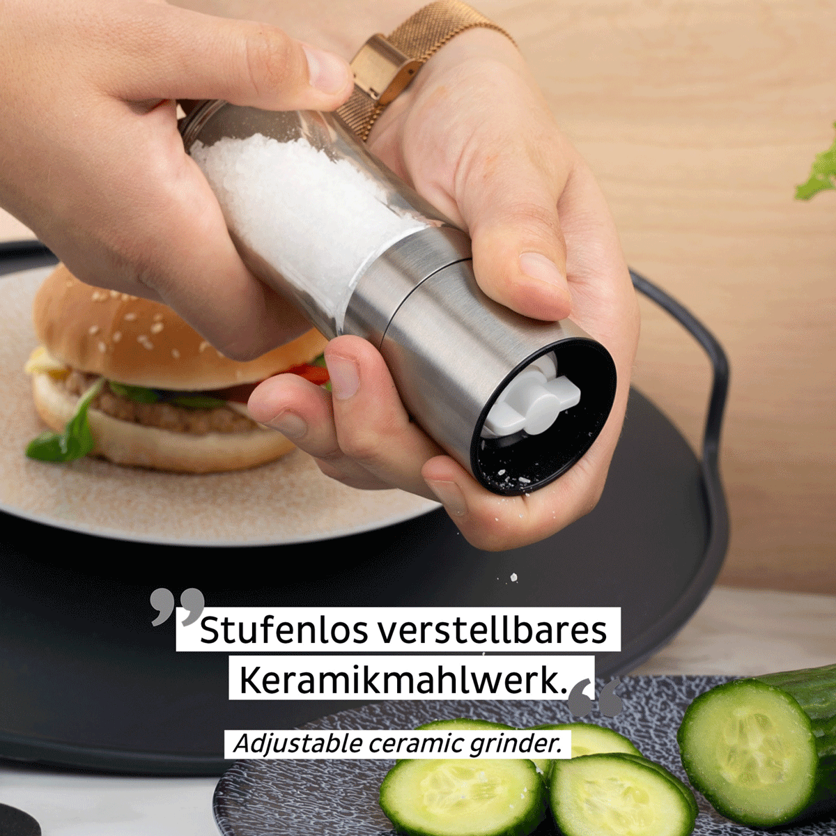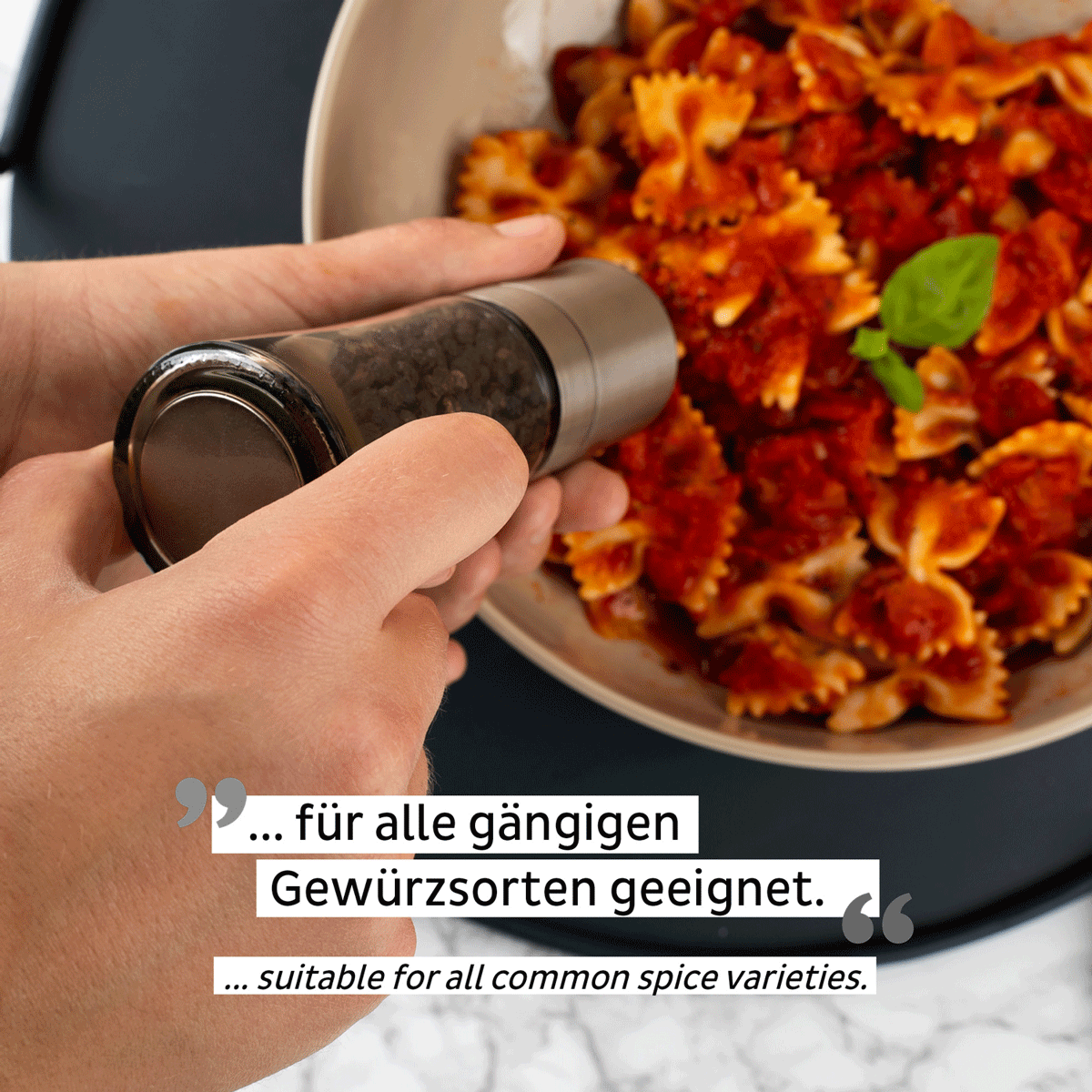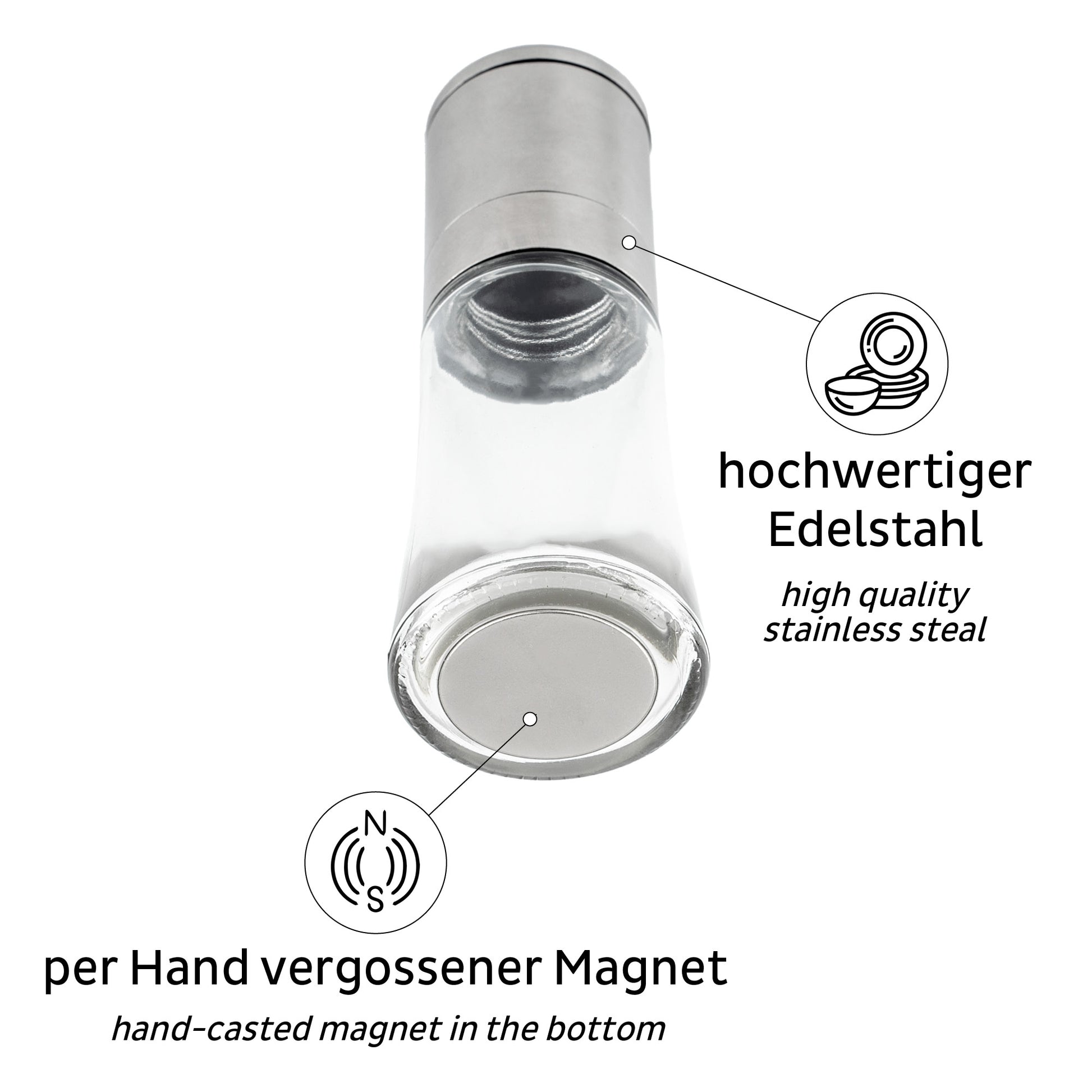 Perfekt abgeschmeckt auf Reisen: Dank unserer magnetischen Gewürzmühlen mit Keramikmahlwerk haben Sie Ihre Lieblingsgewürze jederzeit zur Hand. Ob fein, mittel oder grobkörnig – der Mahlgrad lässt sich je nach Gusto manuell einstellen. Die Mühlen haben eine Füllkapazität von 100 Gramm und sind nachfüllbar. Im Boden der Gewürzmühlen ist ein formschöner Magnet vergossen, der kombiniert mit den metallischen Nano-Gel-Pads die Mühlen auch während der Fahrt hält. Die modernen und stilvollen Mühlen kommen im 2er-Set.